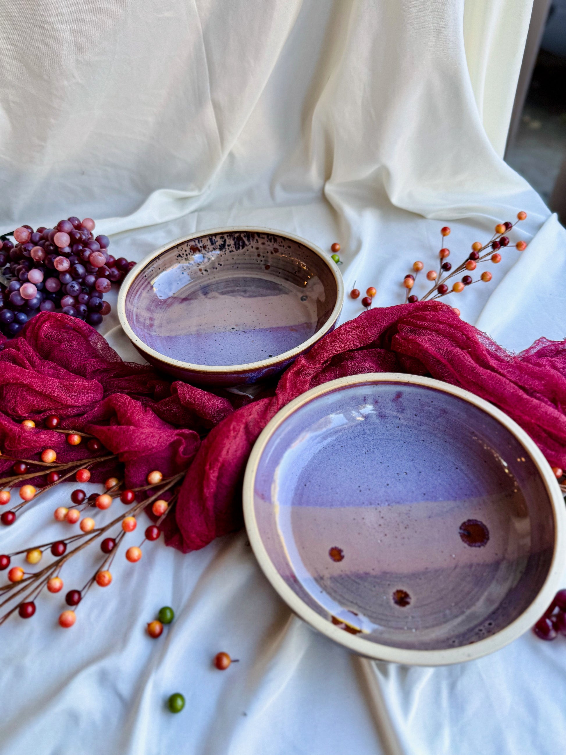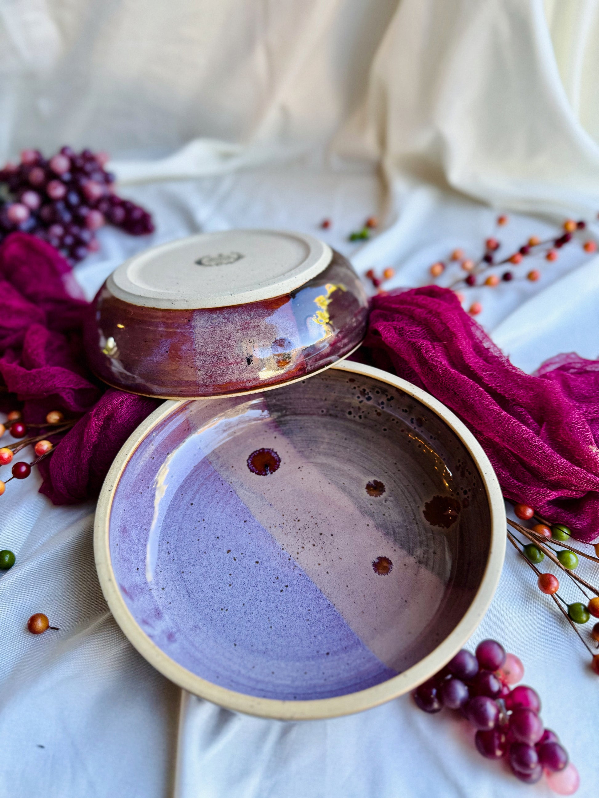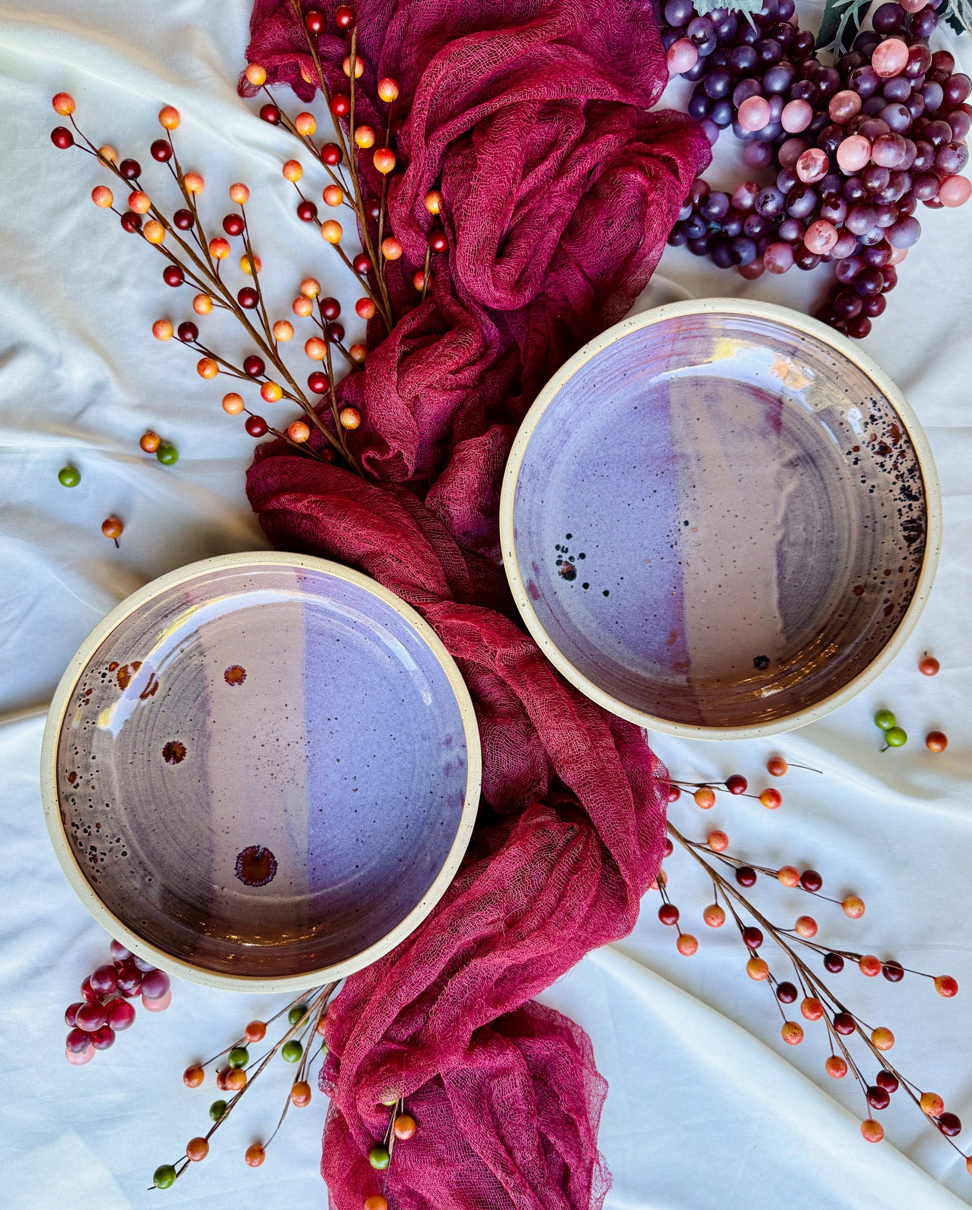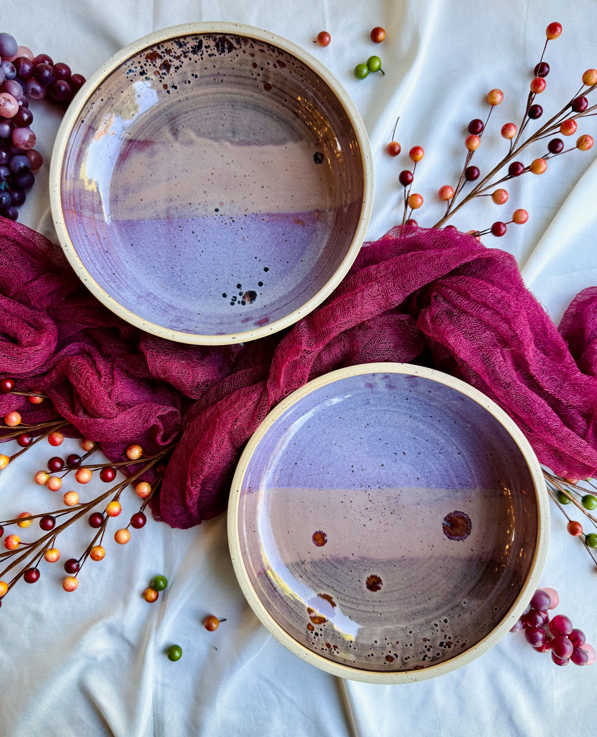 - Handmade in a soft tan speckled clay with peppered cinnamon & purple dusk glaze