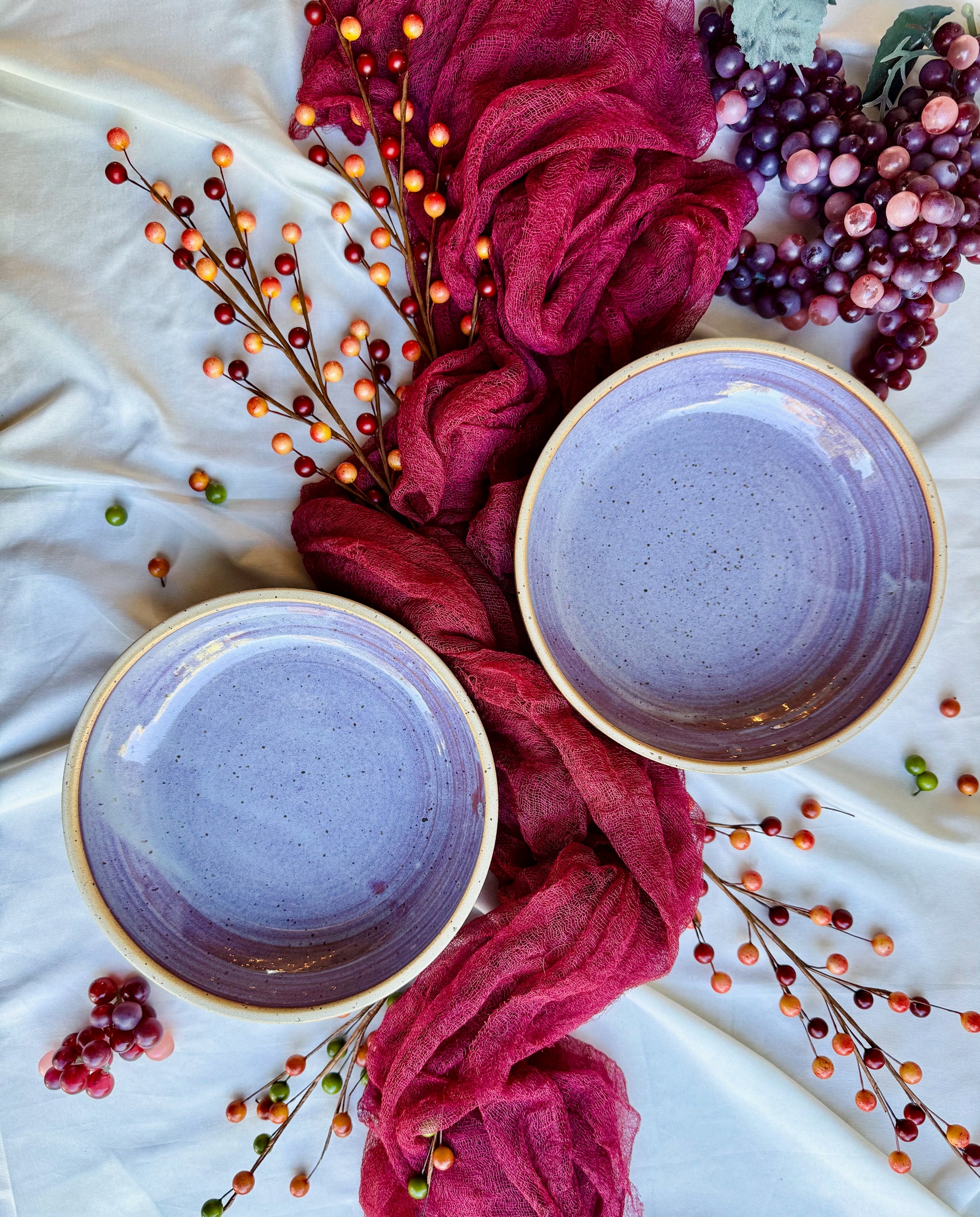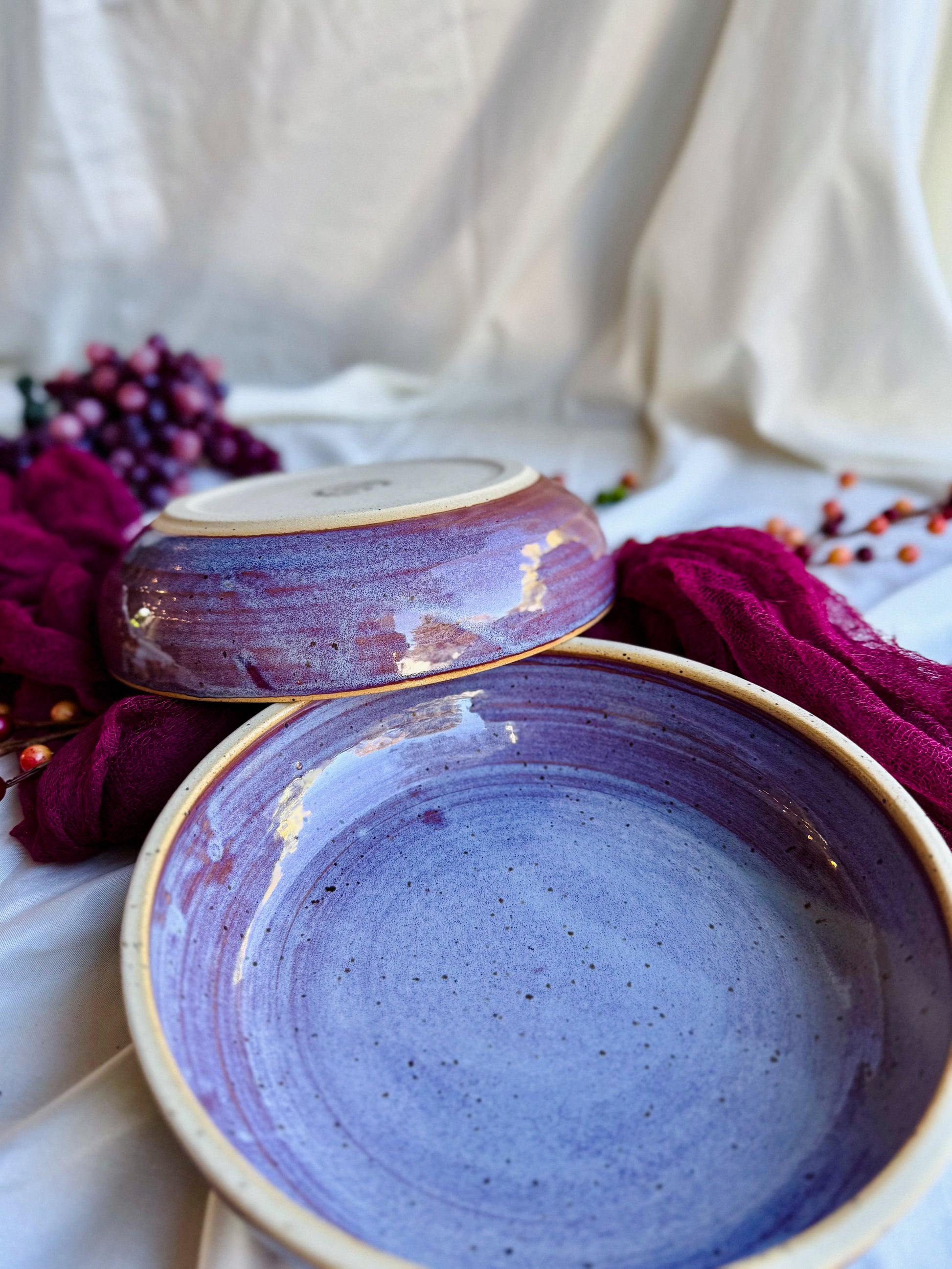 - Handmade in a soft tan speckled clay with purple dusk glaze