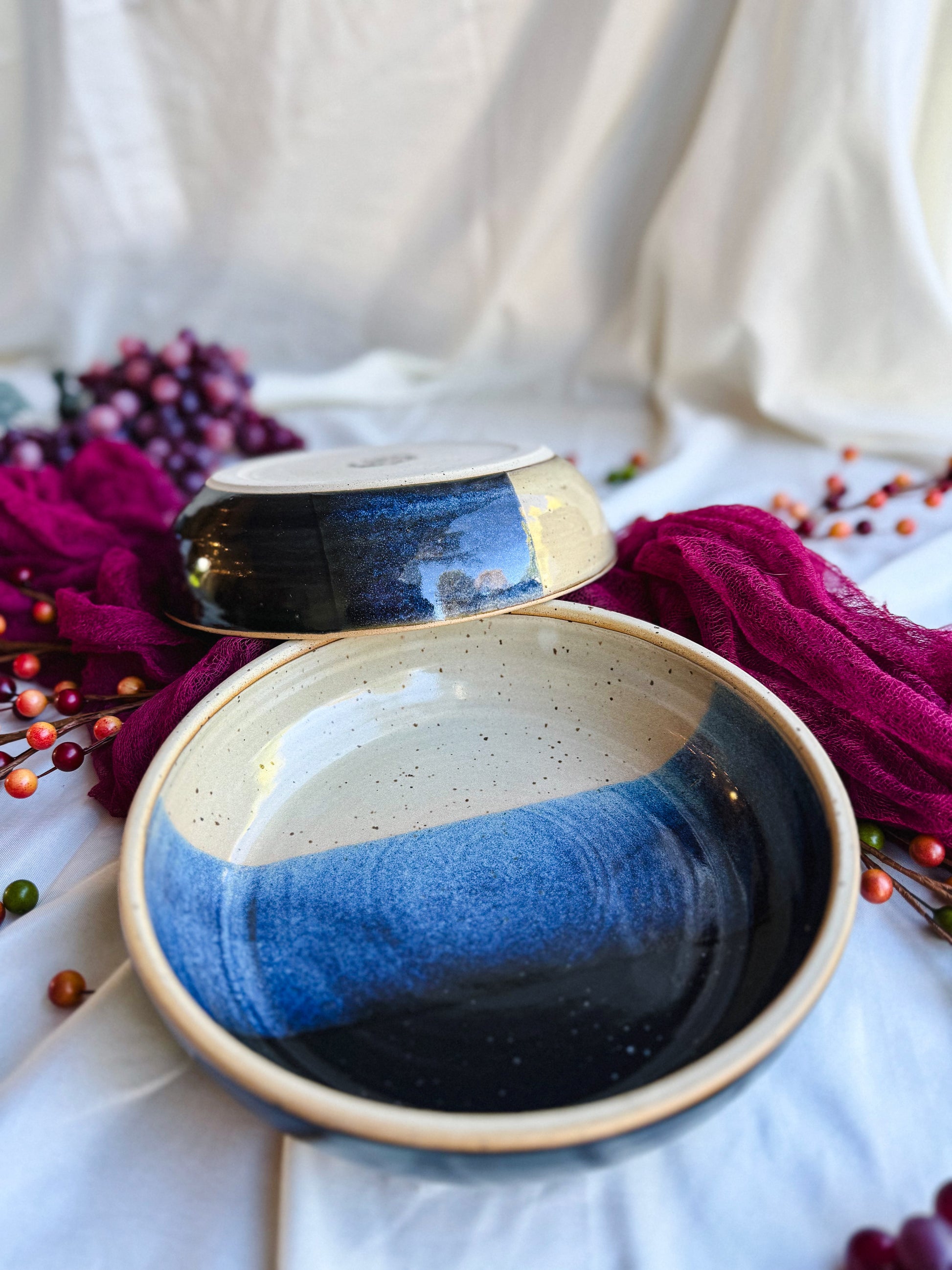 - Handmade in a soft tan speckled clay with midnight & cream glaze