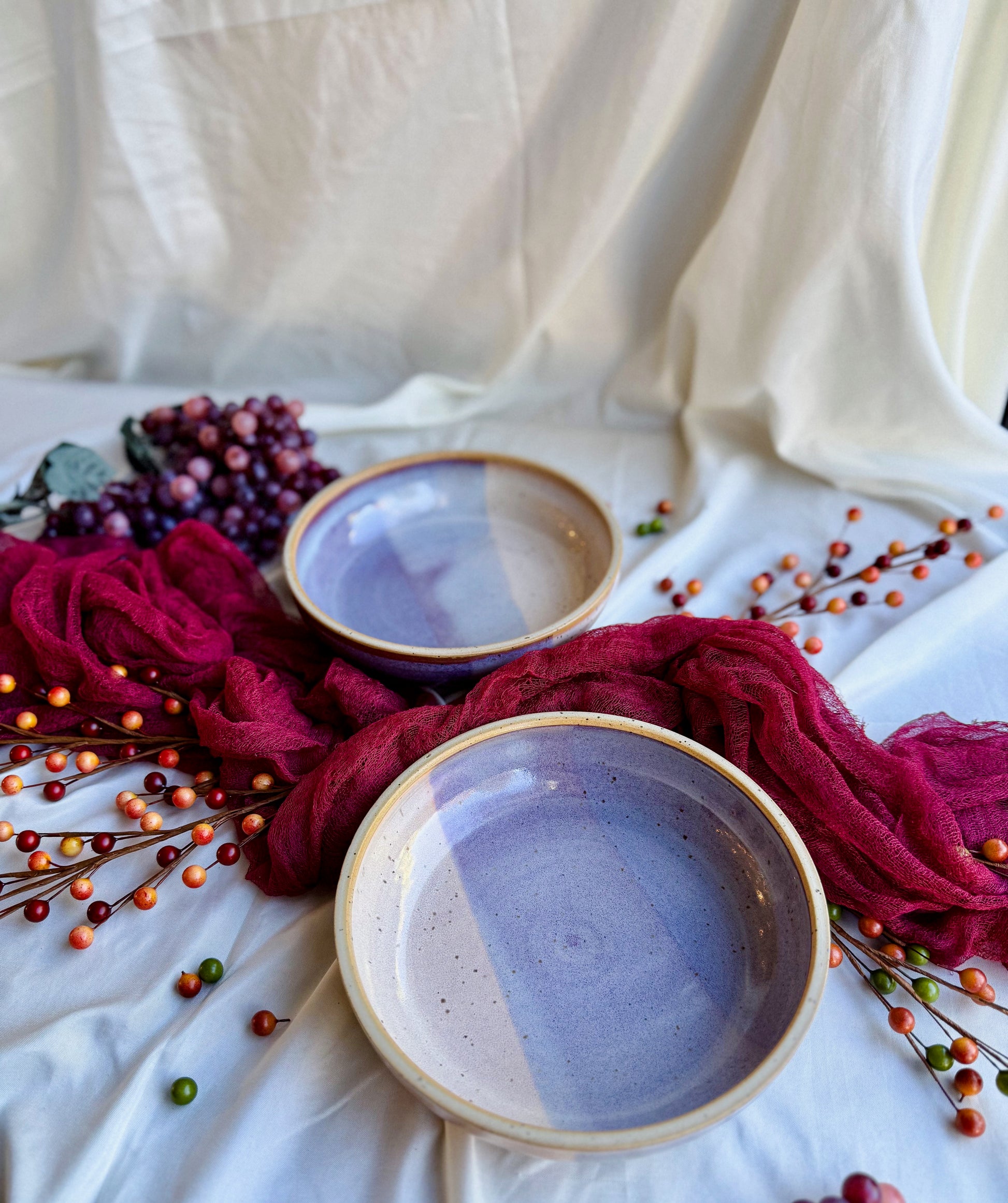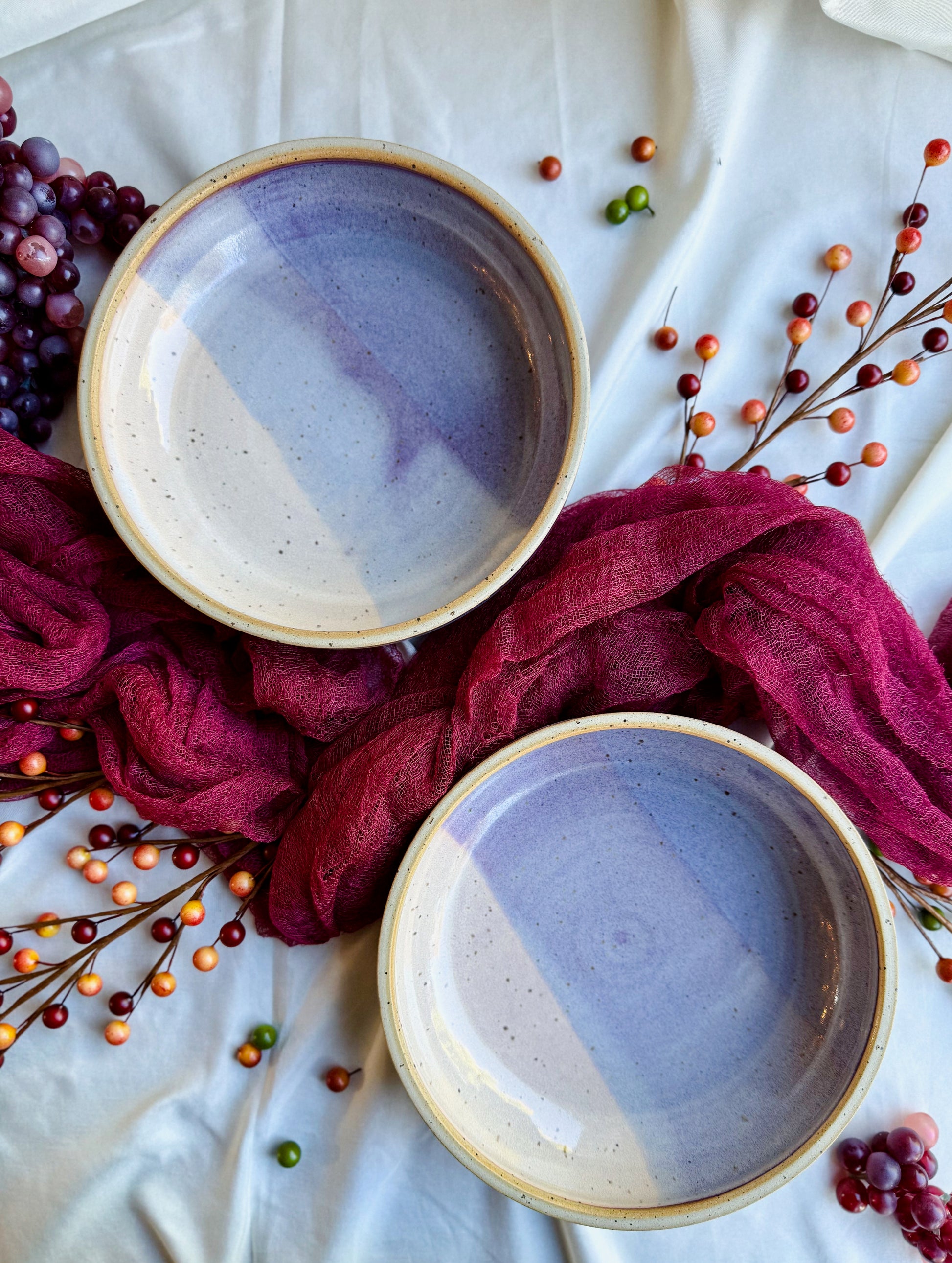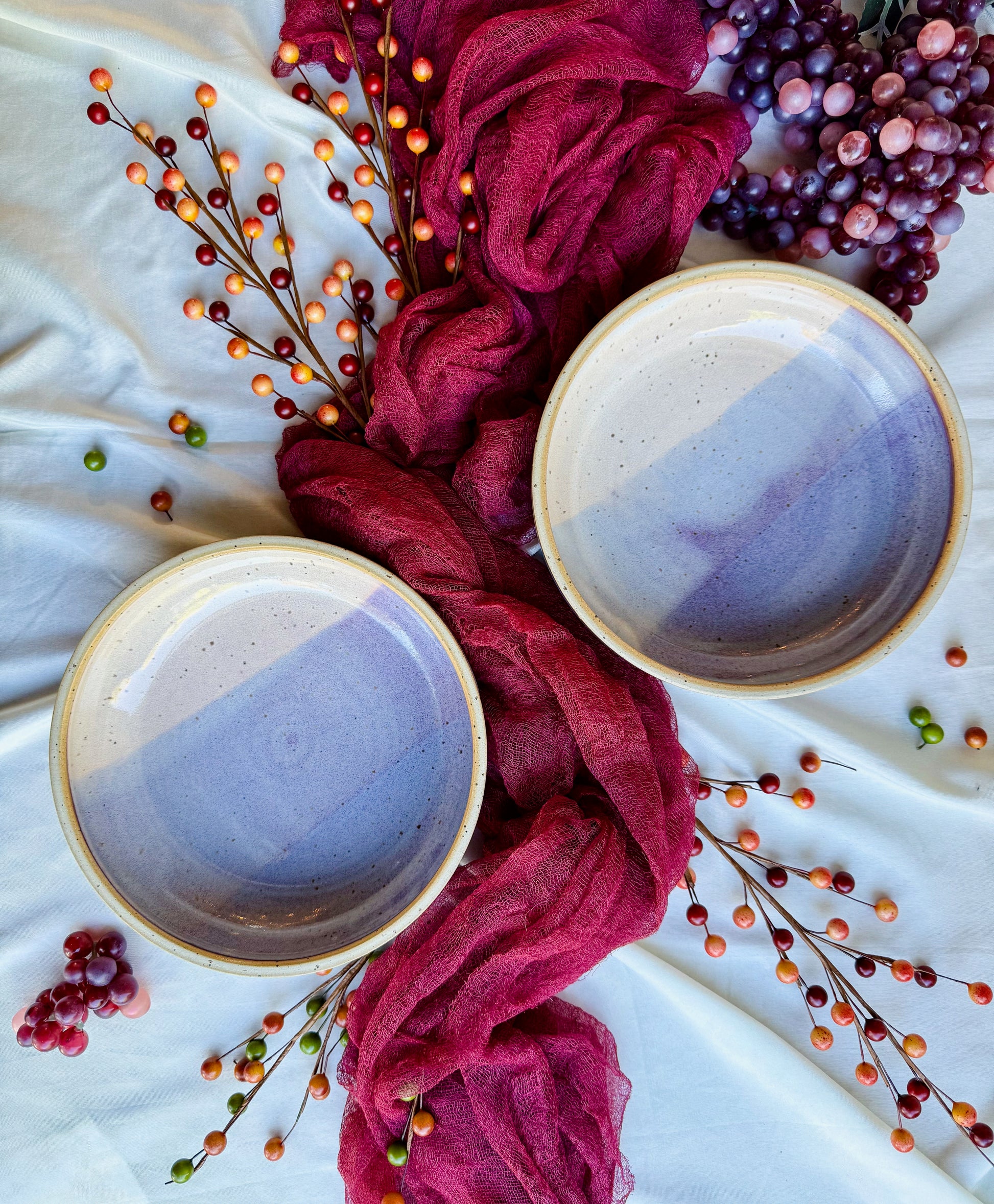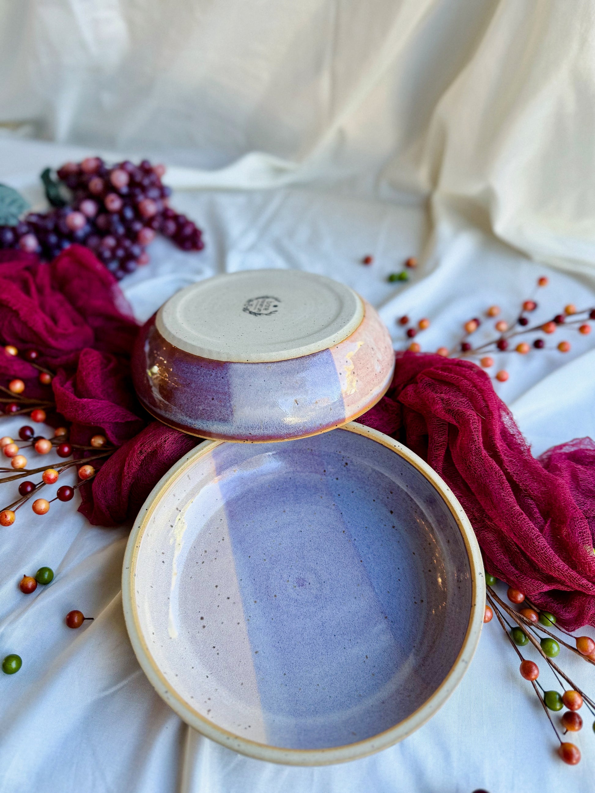 - Handmade in a soft tan speckled clay with purple dusk & sherbet glaze