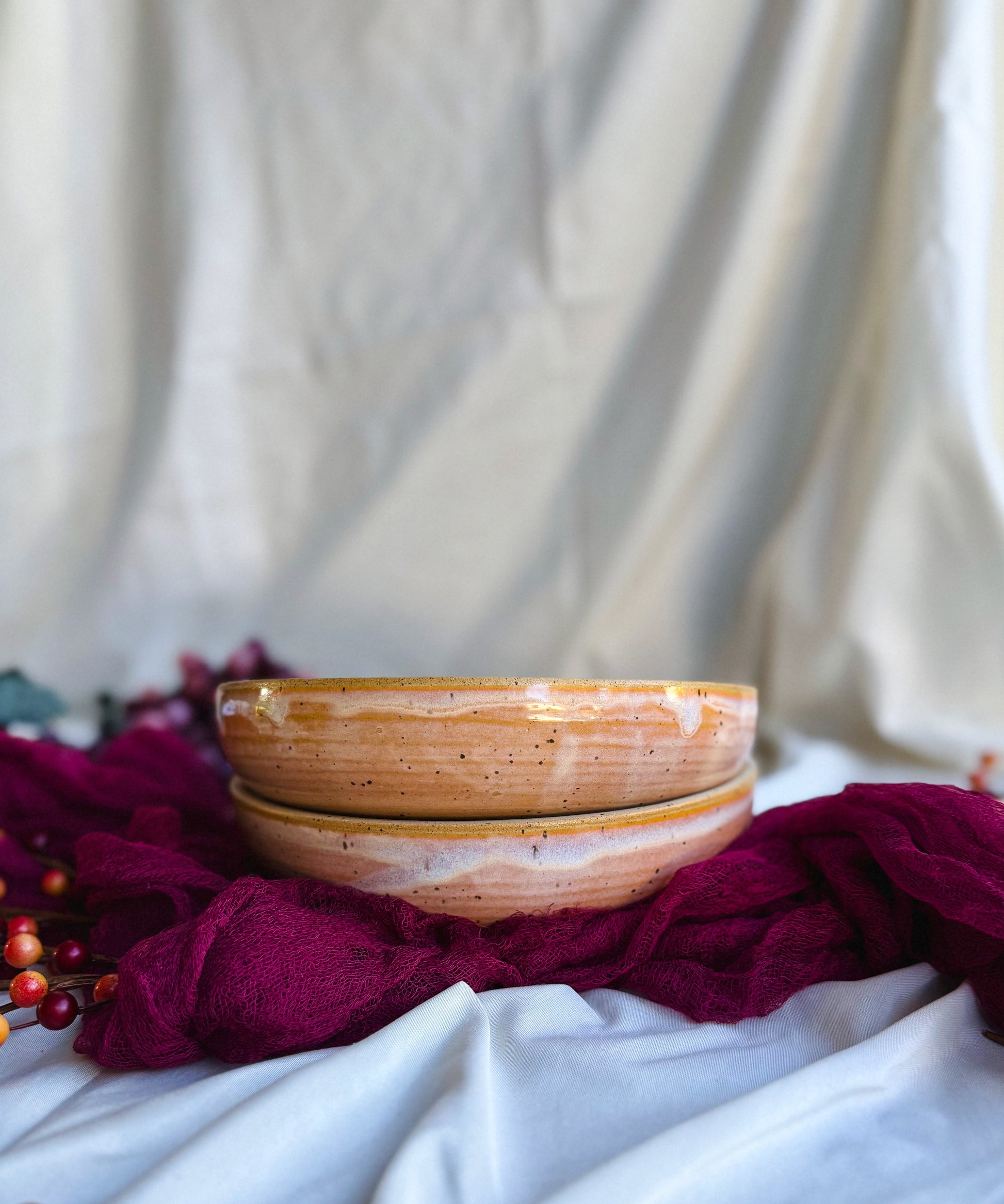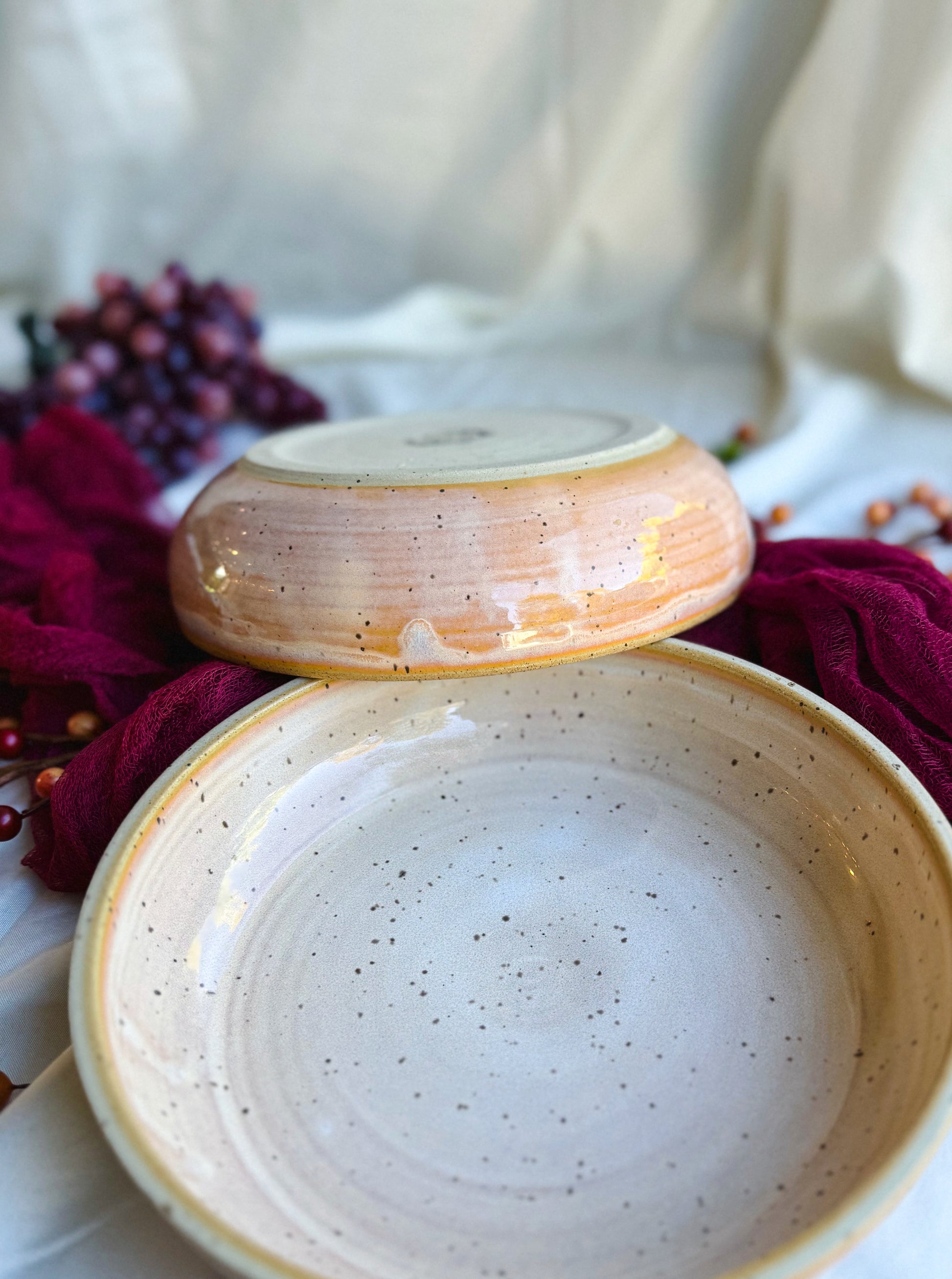 - Handmade in a soft tan speckled clay with sherbet glaze