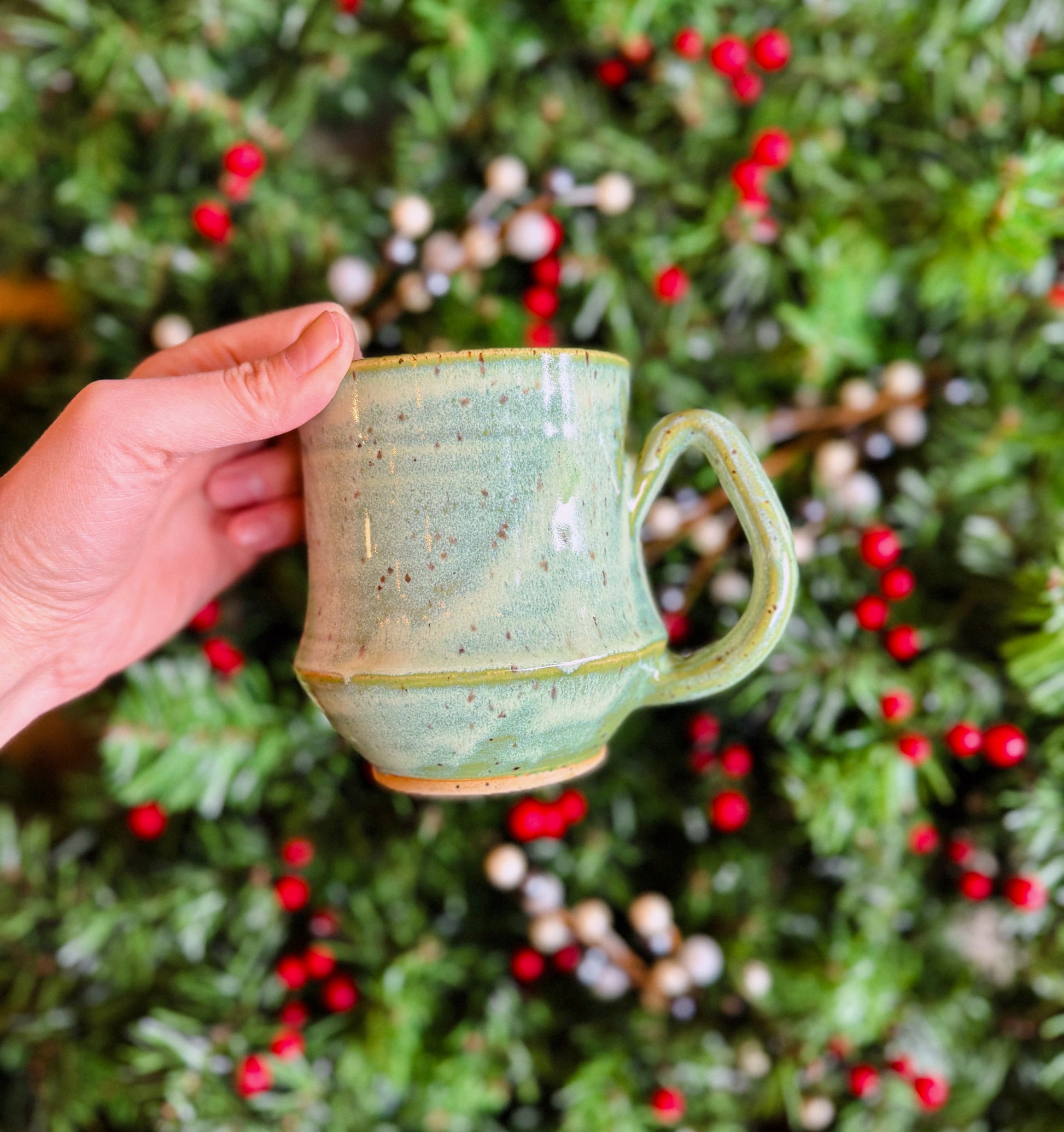 Wheel thrown in sandy speckled clay, glazed in pistachio