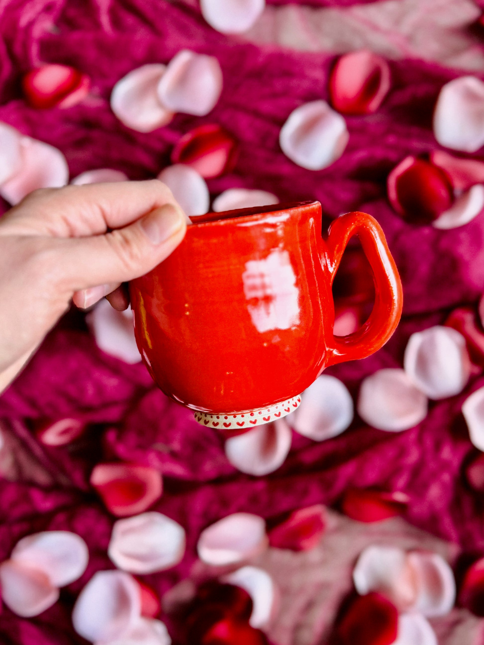 Red valentine mug with hand painted details details along the foot.