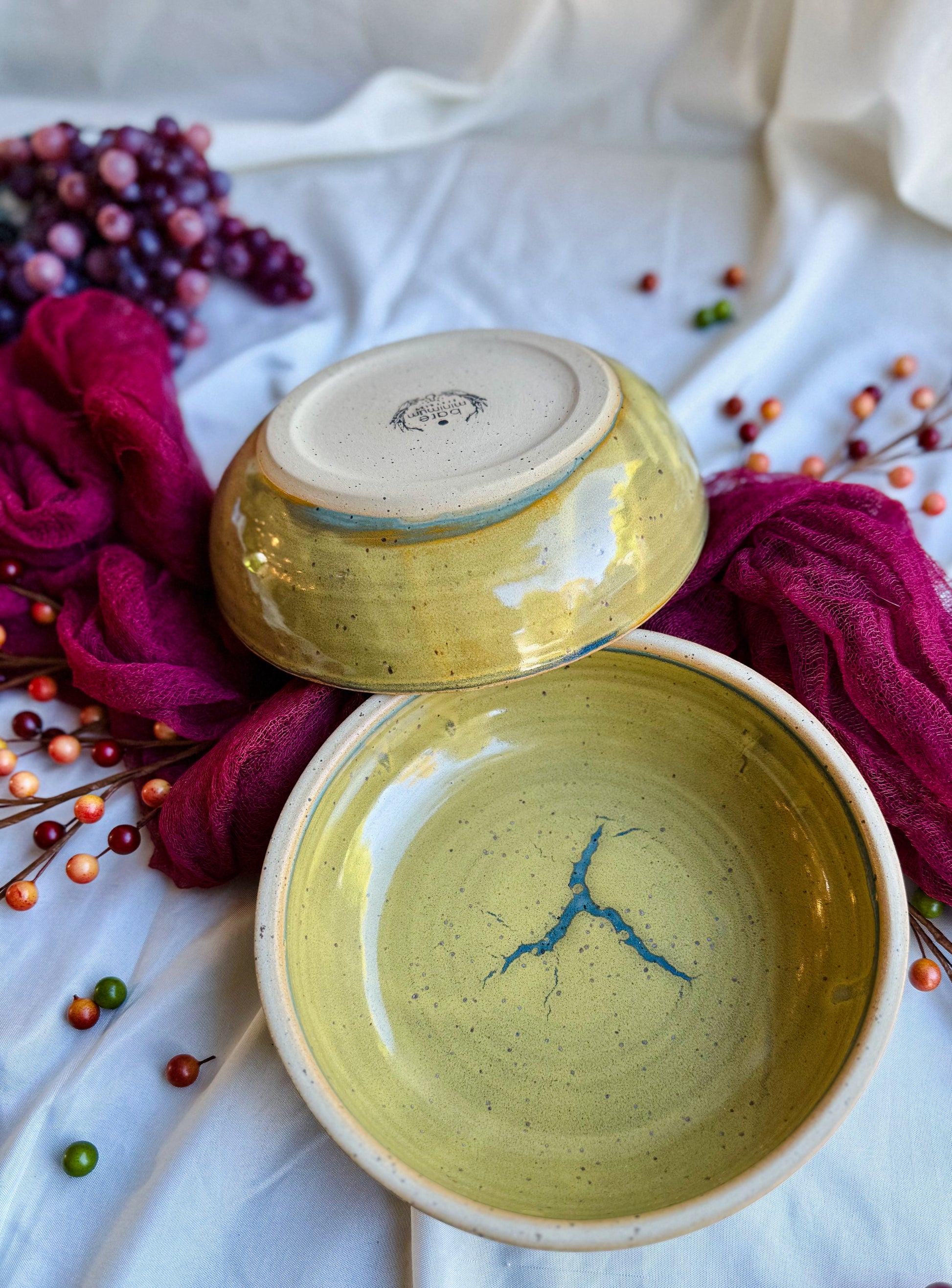 - Handmade in a soft tan speckled clay with crackled mustard glaze