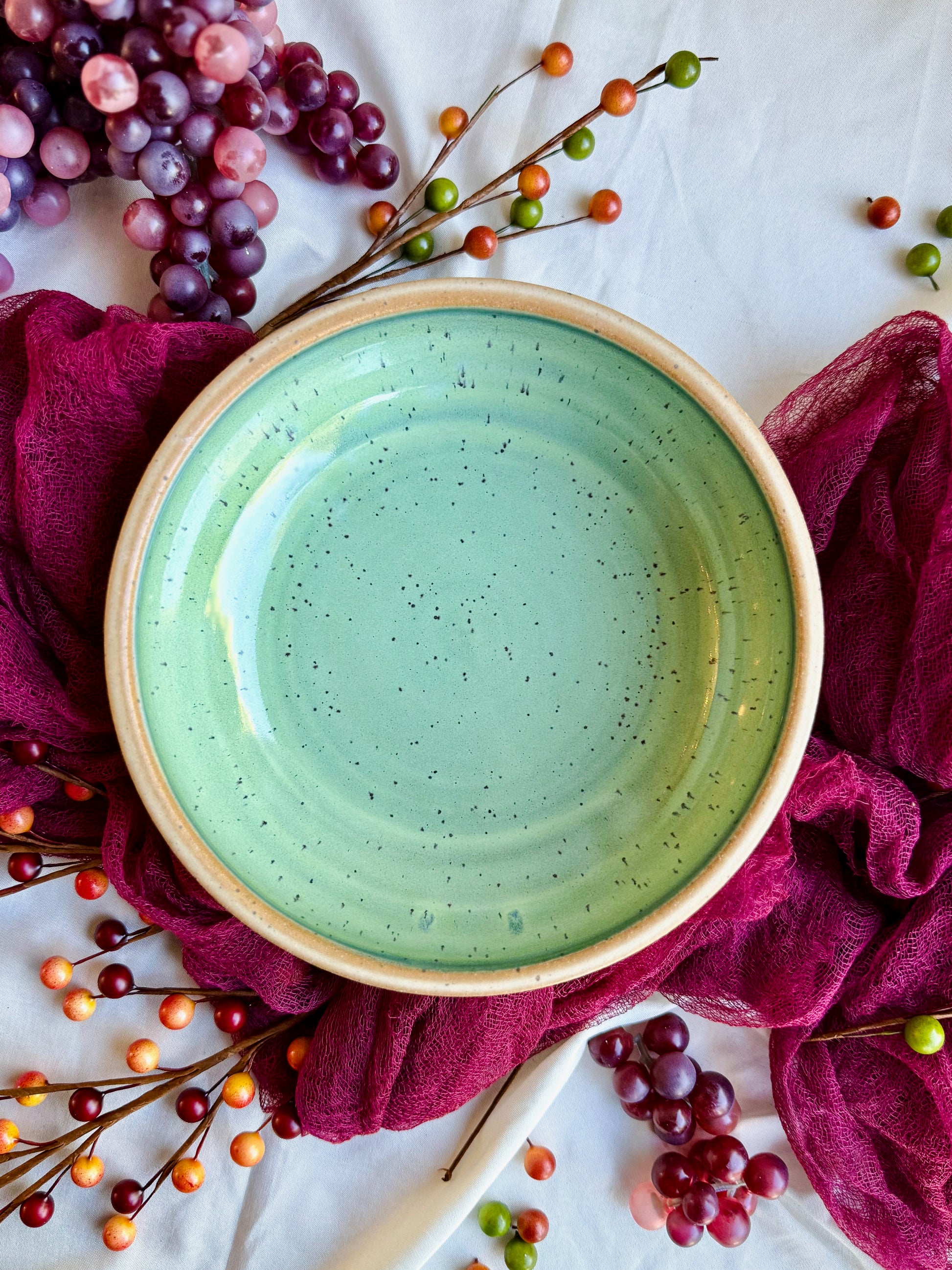- Handmade in a soft tan speckled clay with reptilian green glaze