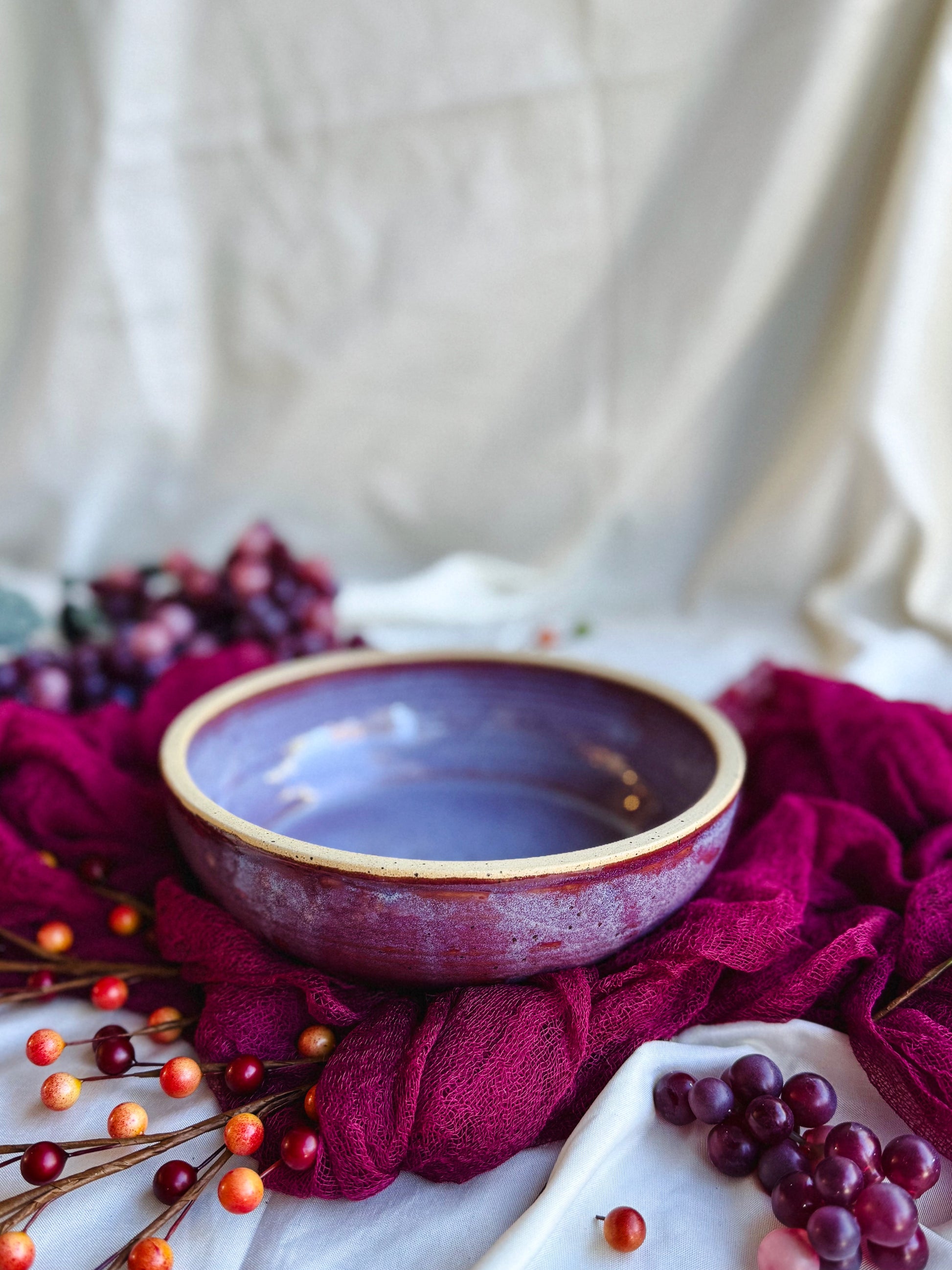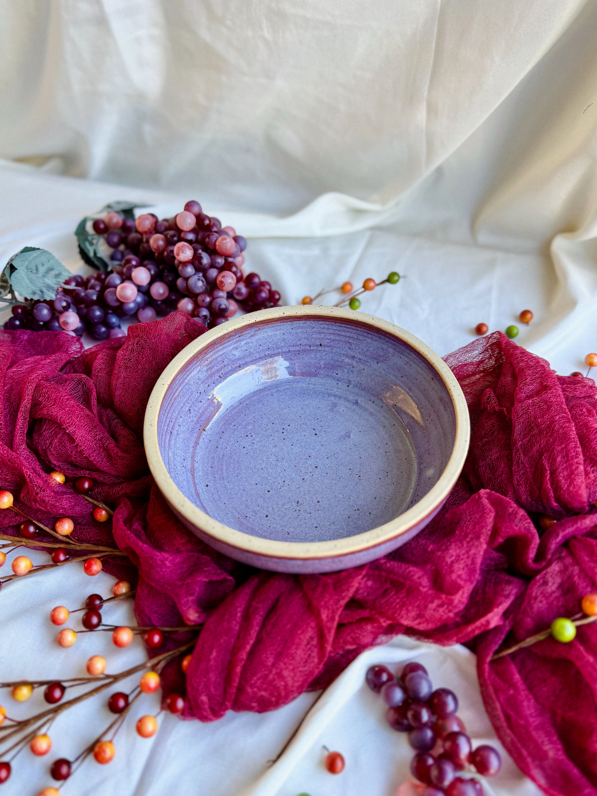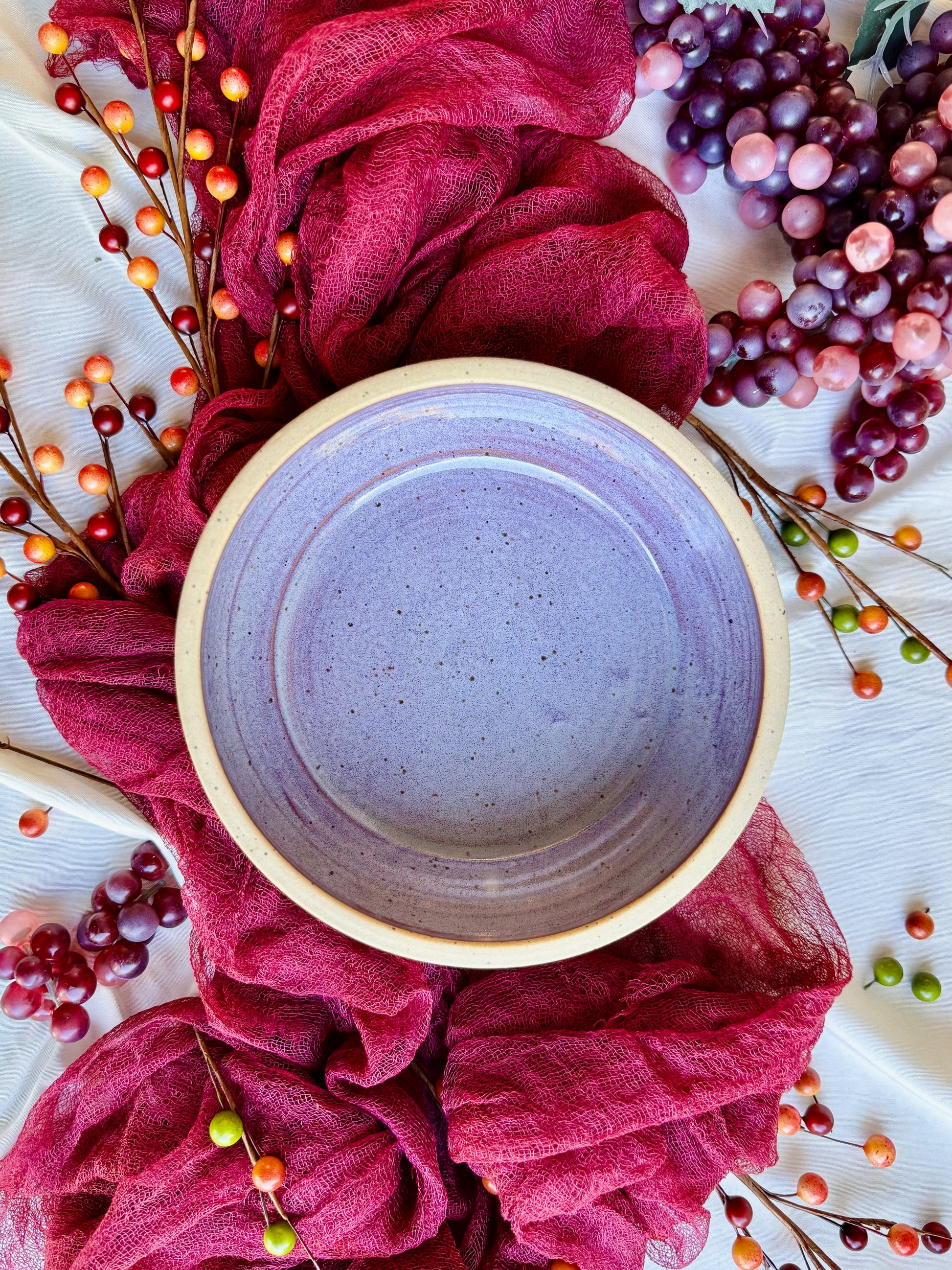 - Handmade in a soft tan speckled clay with purple dusk glaze