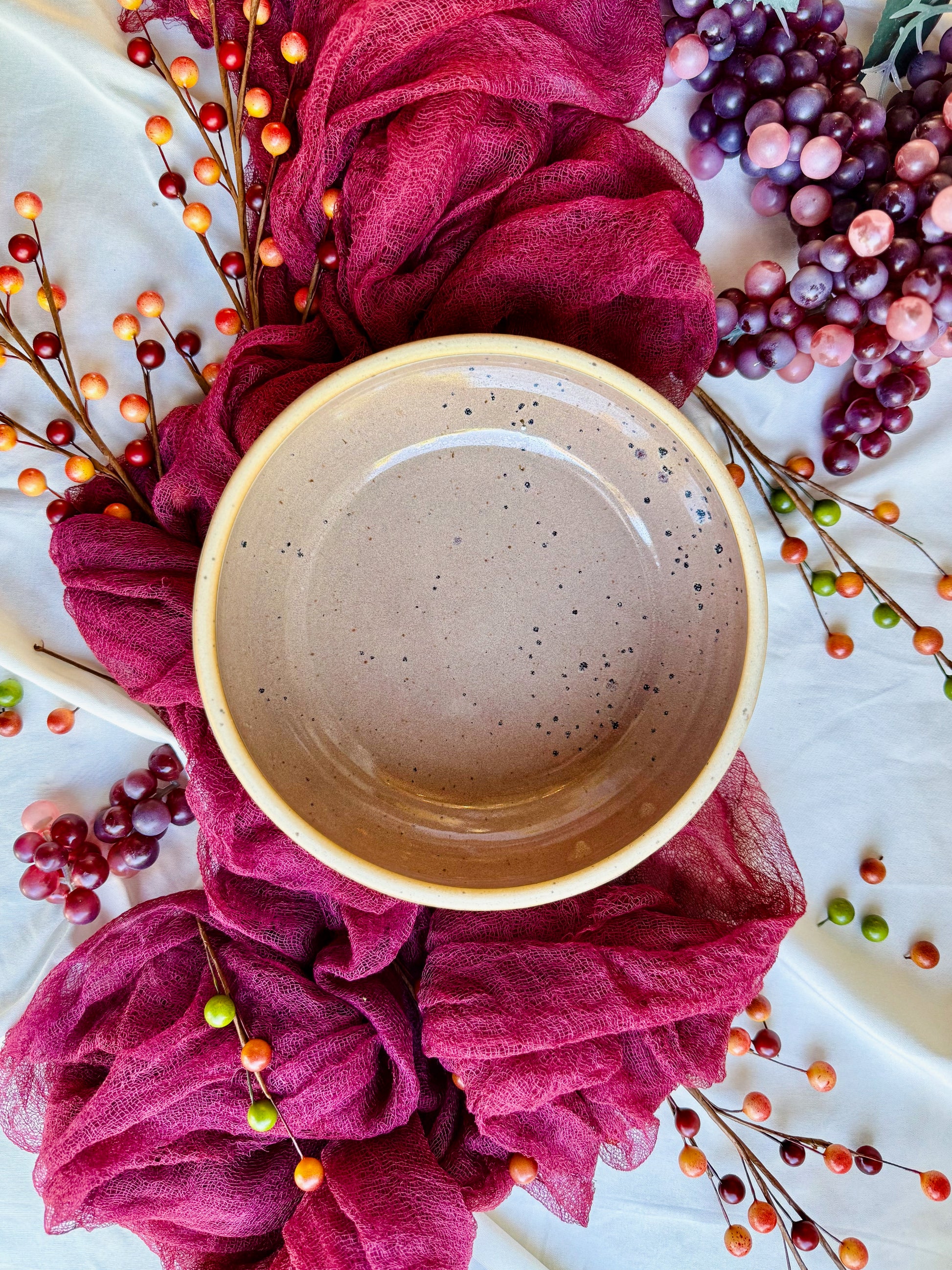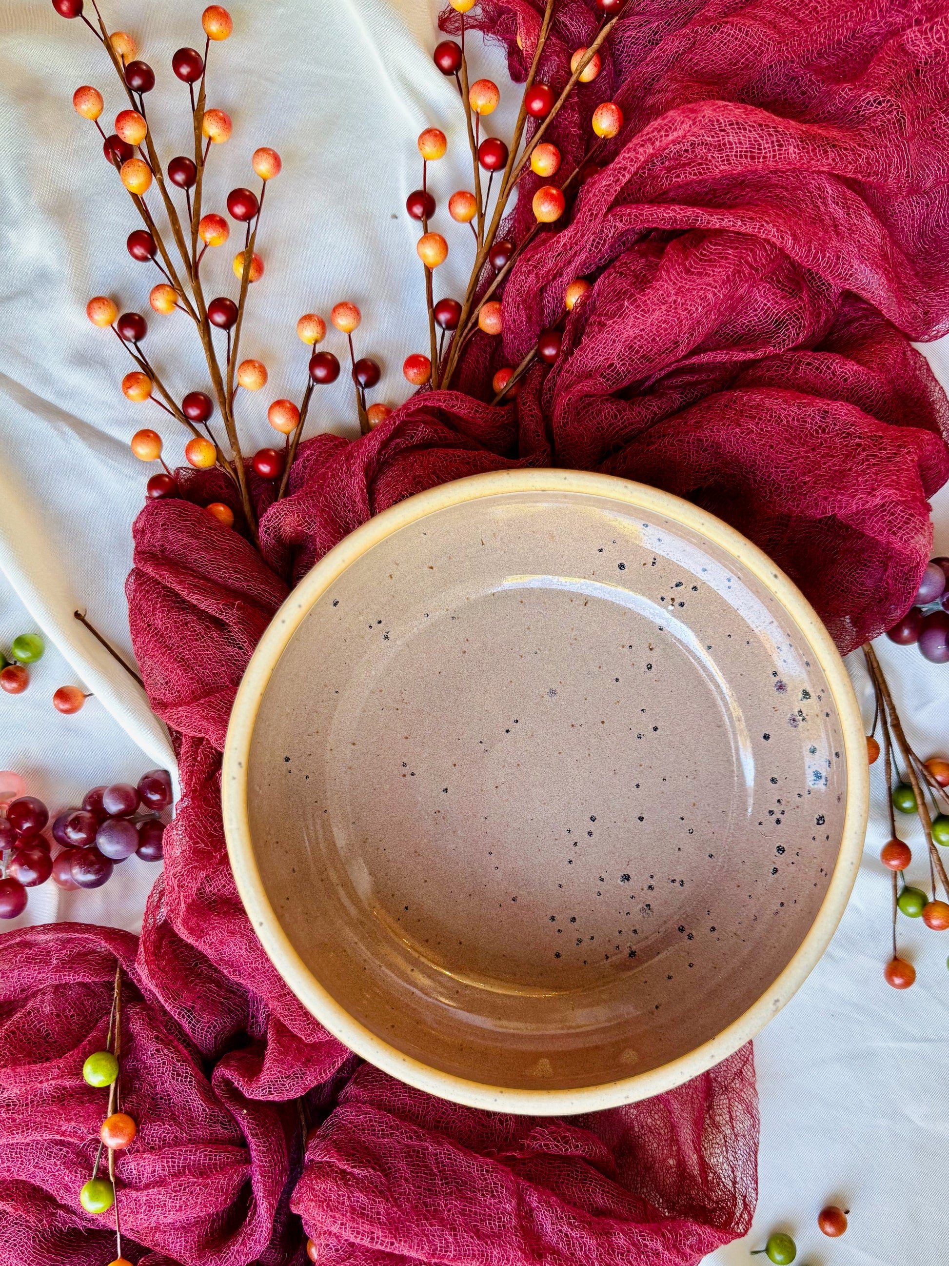 - Handmade in a soft tan speckled clay with mottled peppered cinnamon glaze