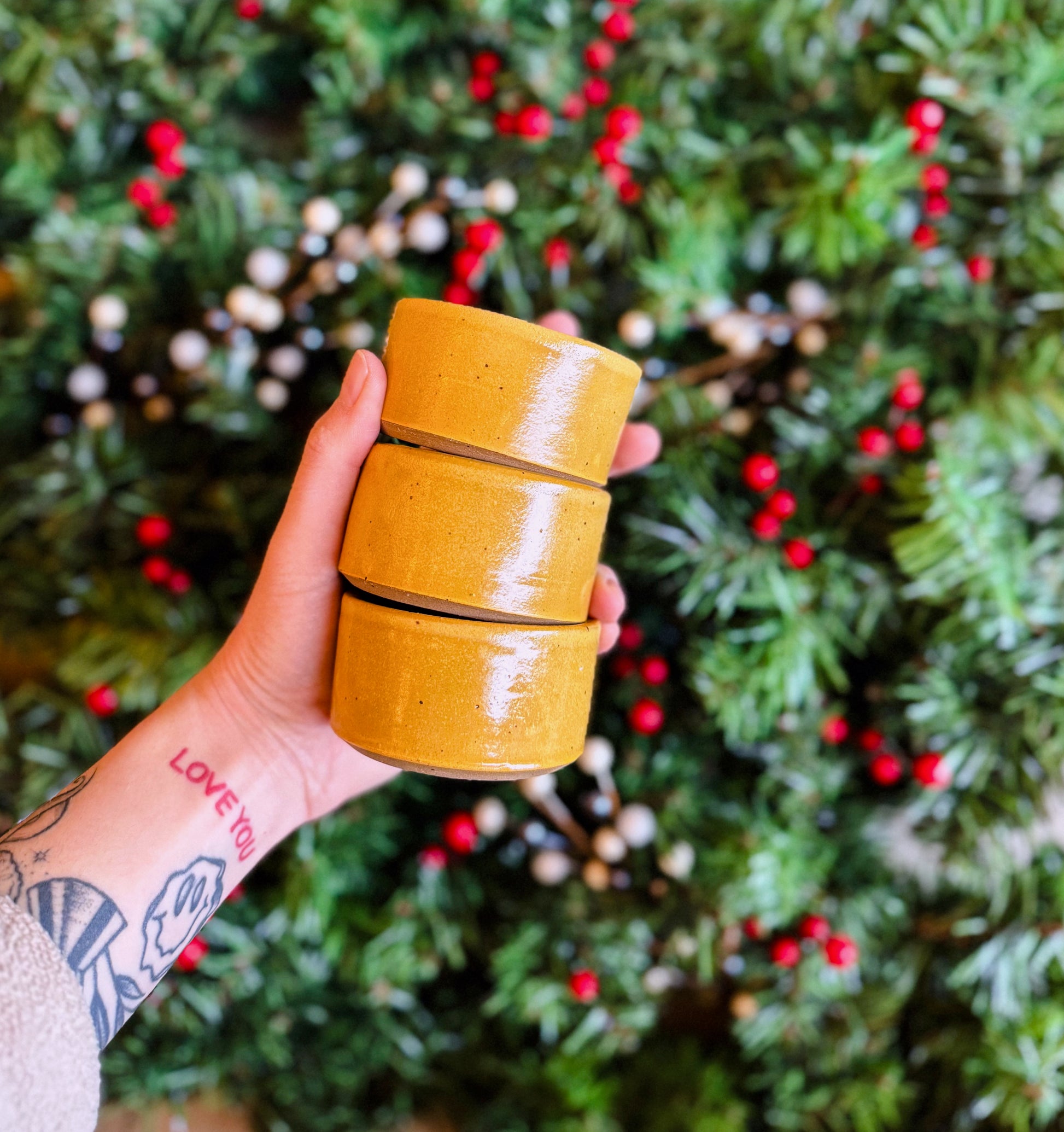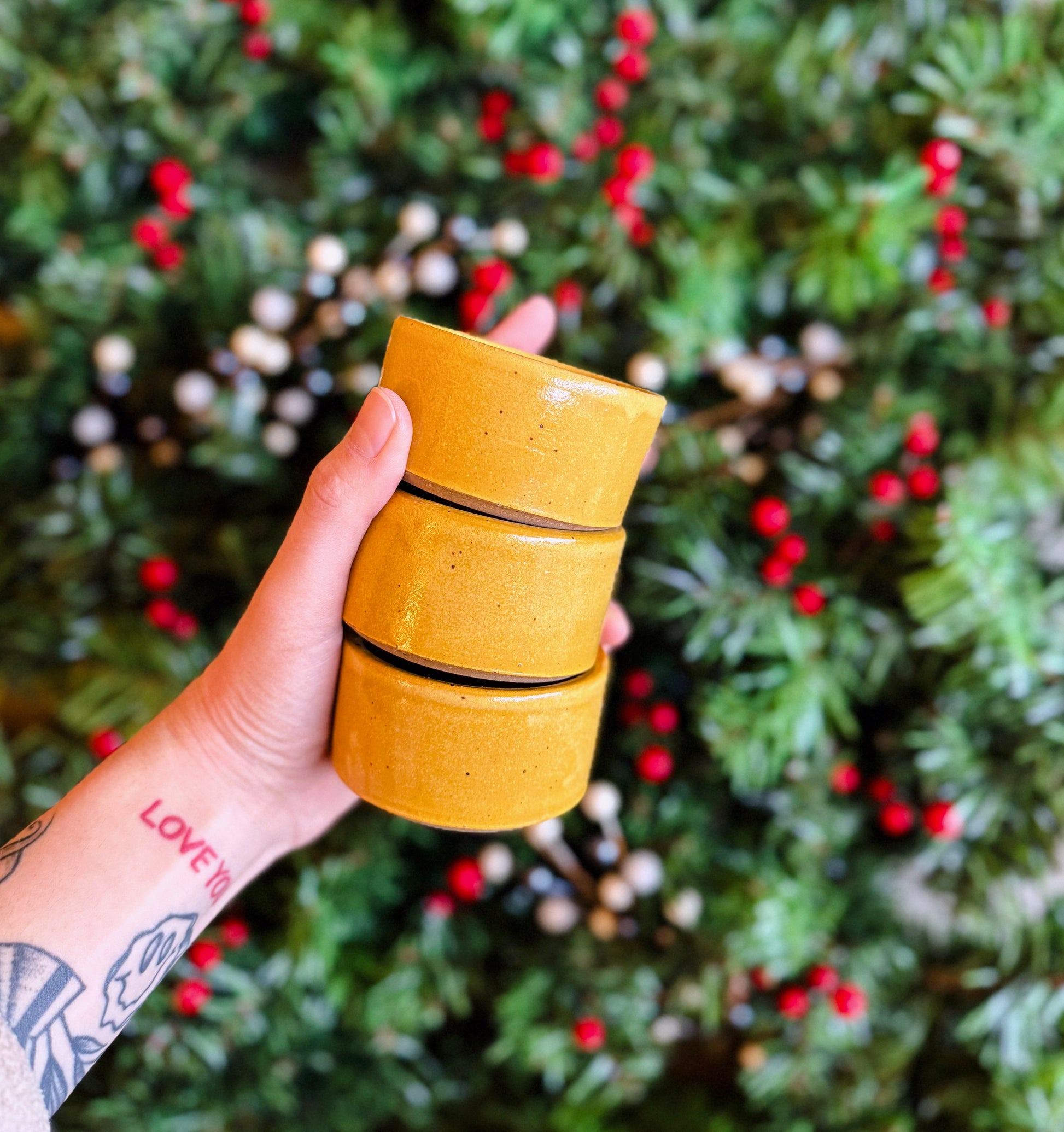 Wheel thrown in gingerbread brown clay, glazed in mustard