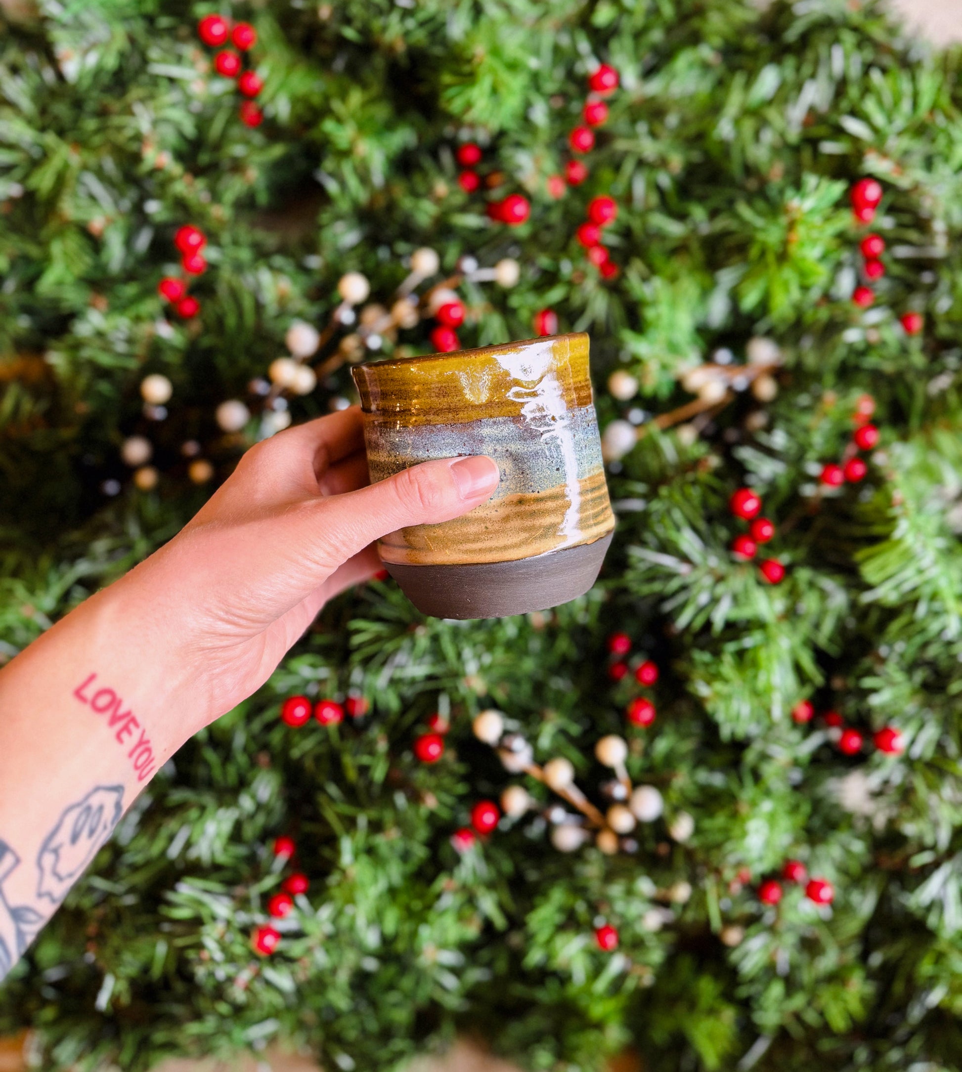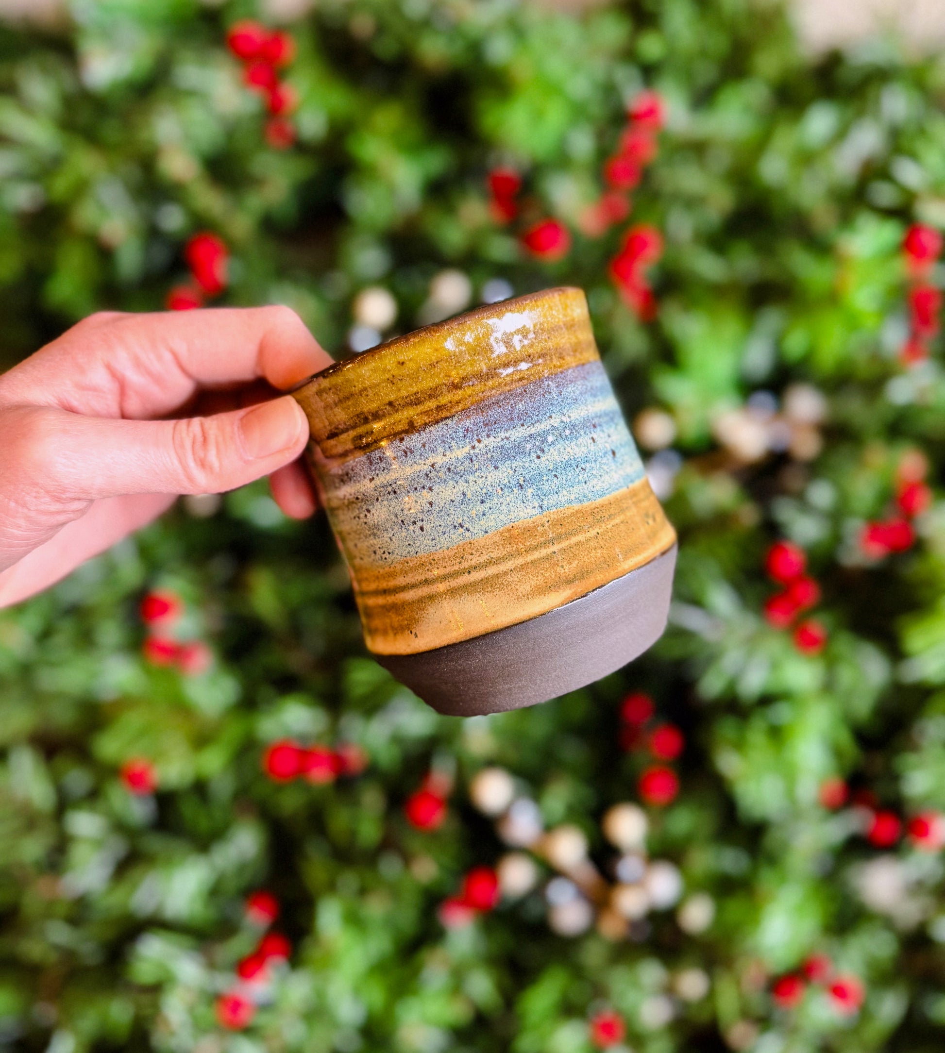 Wheel thrown in my charcoal brown clay, glazed in curry & birch